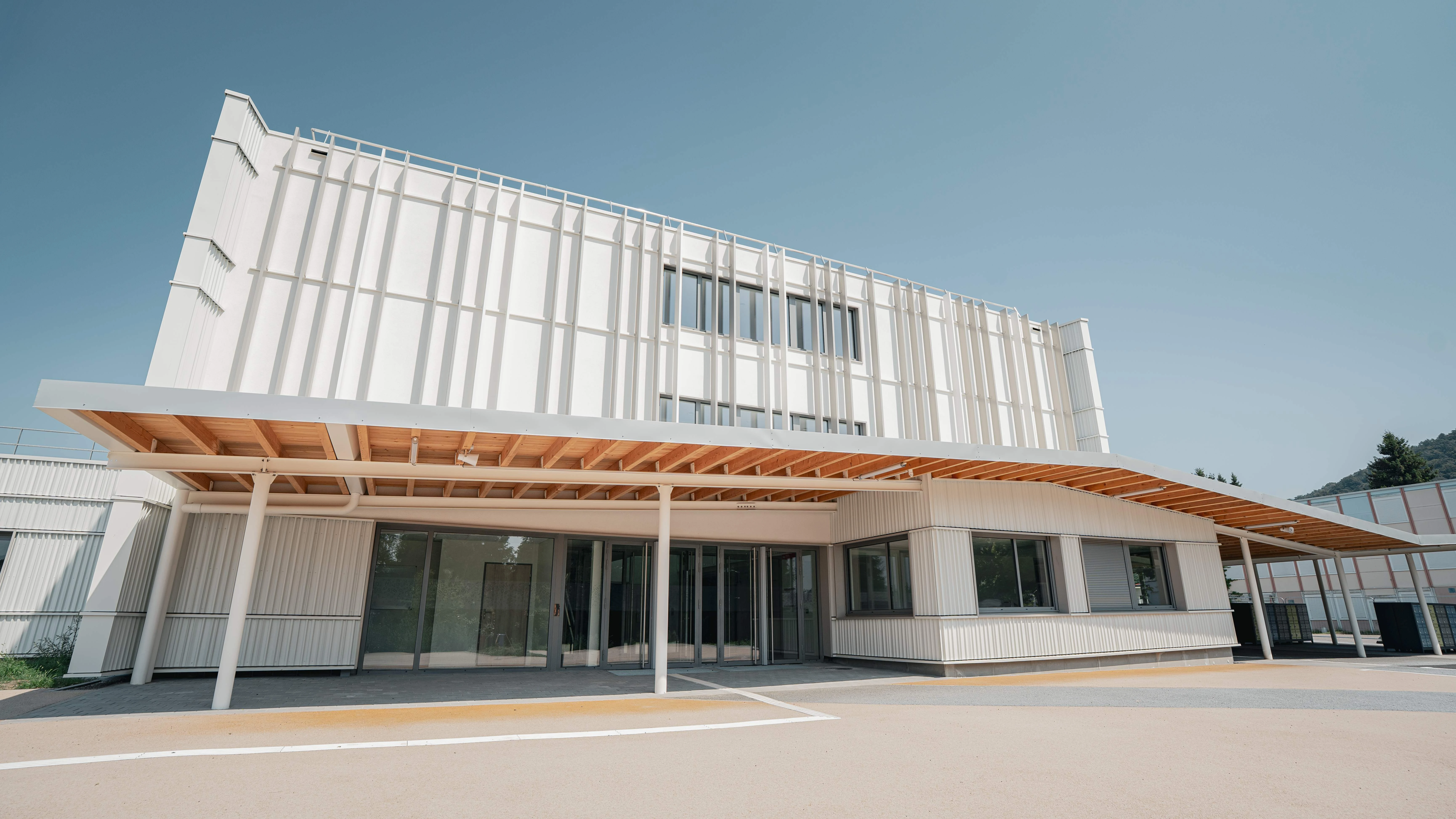 Un bâtiment moderne et épuré à façade blanche ornée de lamelles verticales, avec de grandes fenêtres sous un ciel bleu clair. Une longue marquise en bois et métal blanc protège l'entrée vitrée, s'étendant au-dessus d'un sol pavé aux teintes claires.