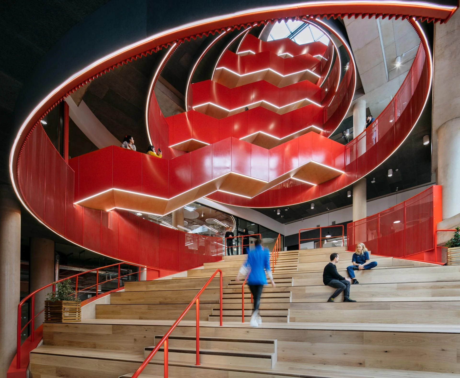 sbarc stands out as the UK's first social science research park and features another UK first: the Oculus staircase. This sculptural open stair travels through a slanting void, designed to spark engagement and collaboration across diverse disciplines. The staircase starts as a social hub on the ground floor and creates breakout zones at each level, reflecting the building’s ethos of openness and connection.