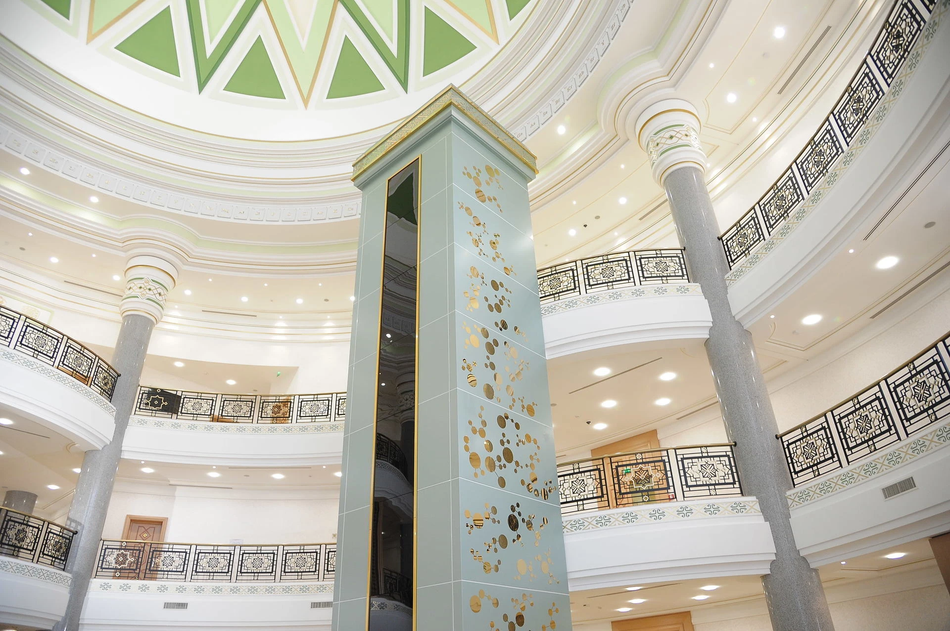Grand multi-story atrium avec un puits d'ascenseur central bleu-gris clair décoré de motifs circulaires dorés abstraits. Il est entouré de balcons blancs courbés avec des garde-corps ornés noirs et or, sous un plafond en dôme orné de motifs géométriques verts et or.