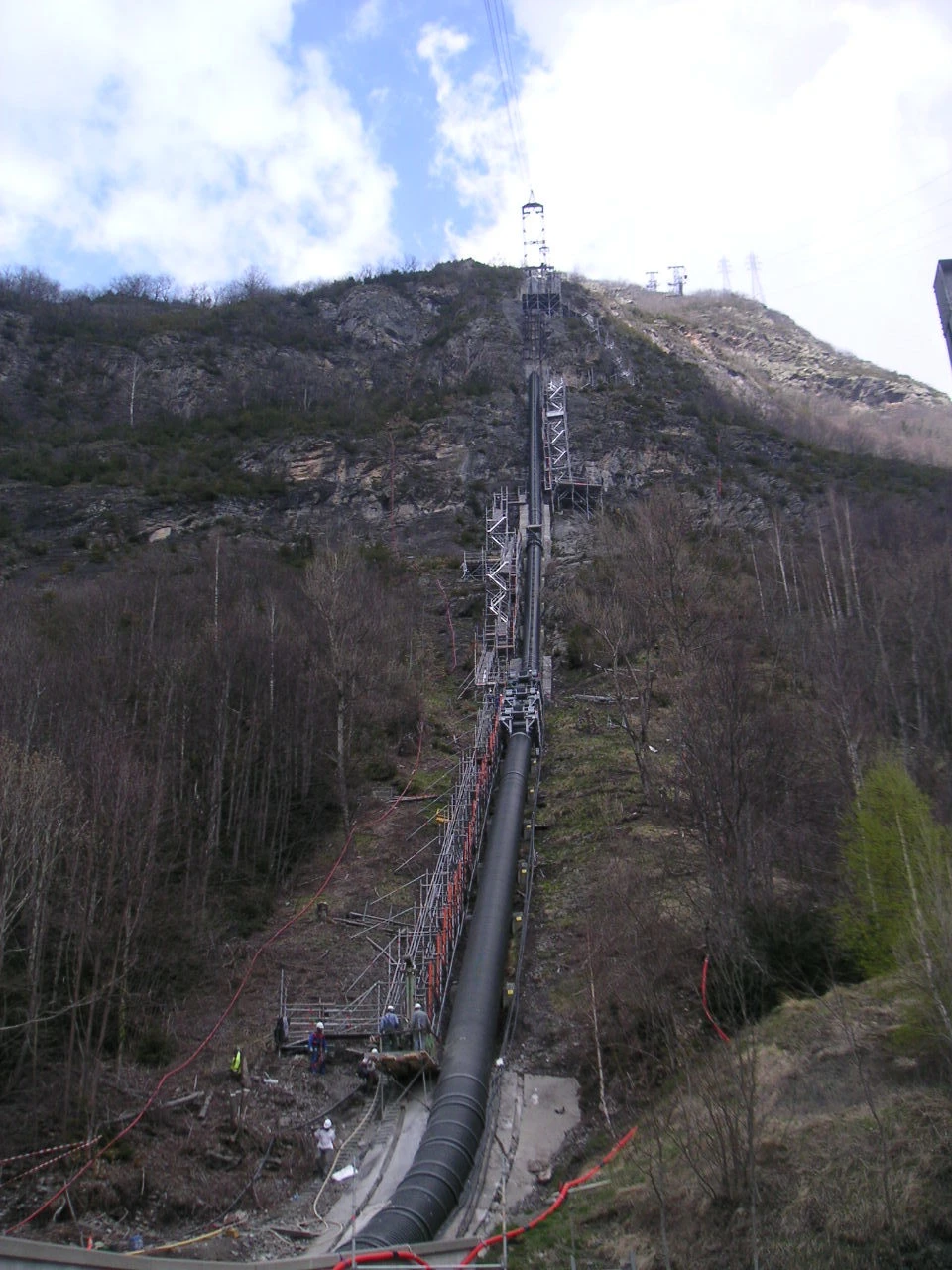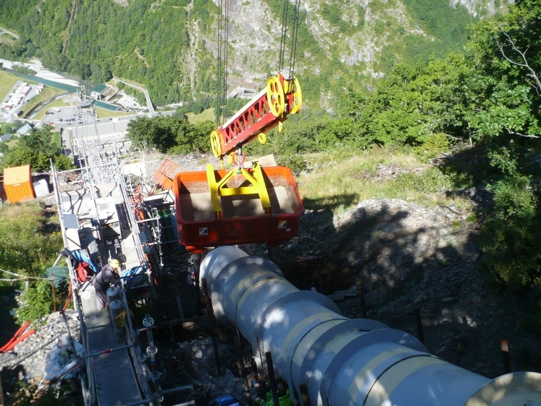 In 2010, Bouygues Travaux Publics Régions France carried out major demolition and reconstruction work on the lower section of the Pragnères penstock, enabling the power plant's turbines to be supplied from high-altitude reservoirs. The section in question covers a 500-meter drop and is 800 meters long, including 100 meters of tunnel, and is supported by nine reinforced concrete structures that were rebuilt to anchor the penstock to the cliff.