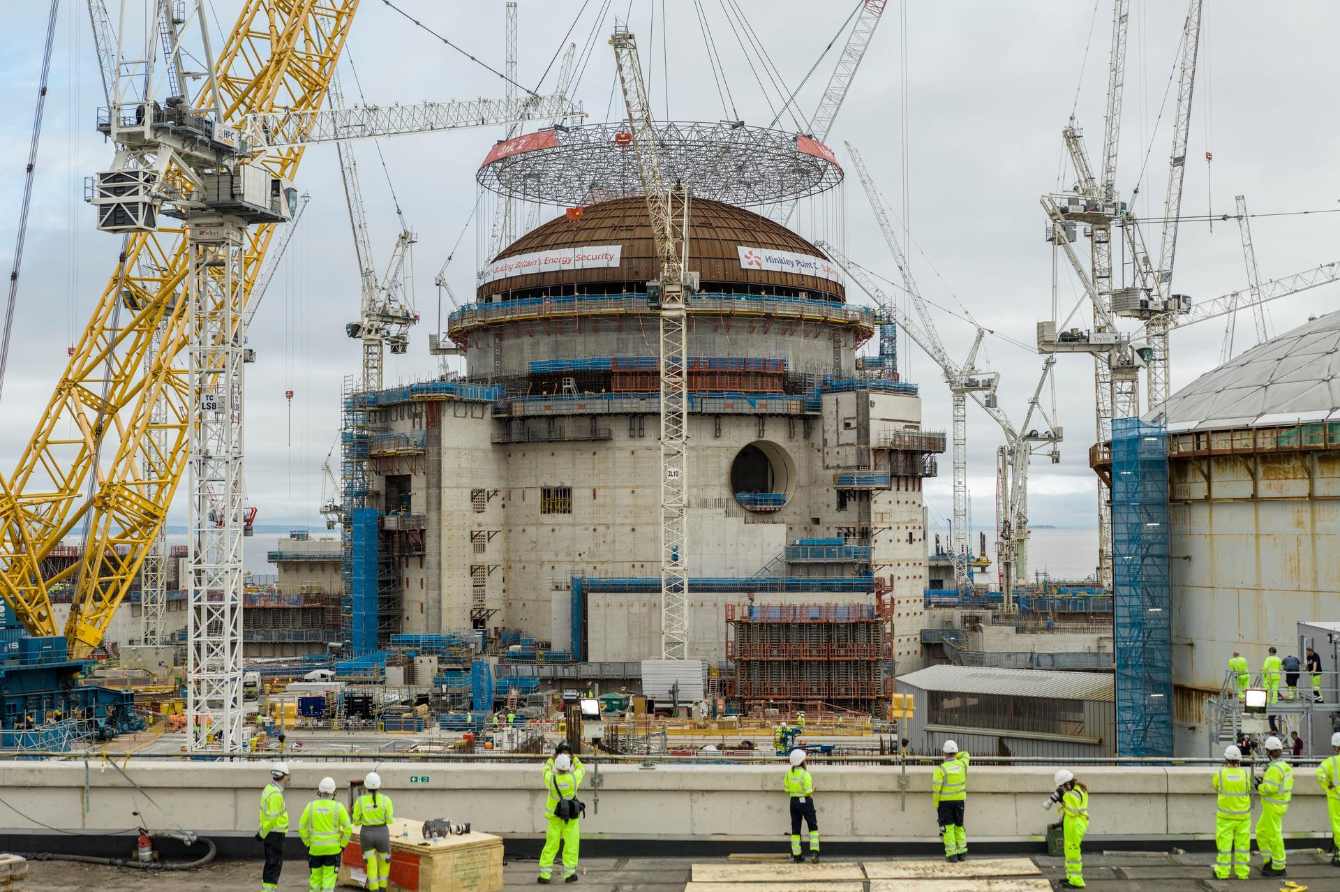 Chantier de construction massif de la centrale nucléaire de Hinkley Point C, montrant une structure de réacteur en béton avec un grand dôme brun, entourée de nombreuses grues industrielles blanches et jaunes et d'échafaudages bleus, avec des ouvriers en gilets de sécurité jaune vif au premier plan.