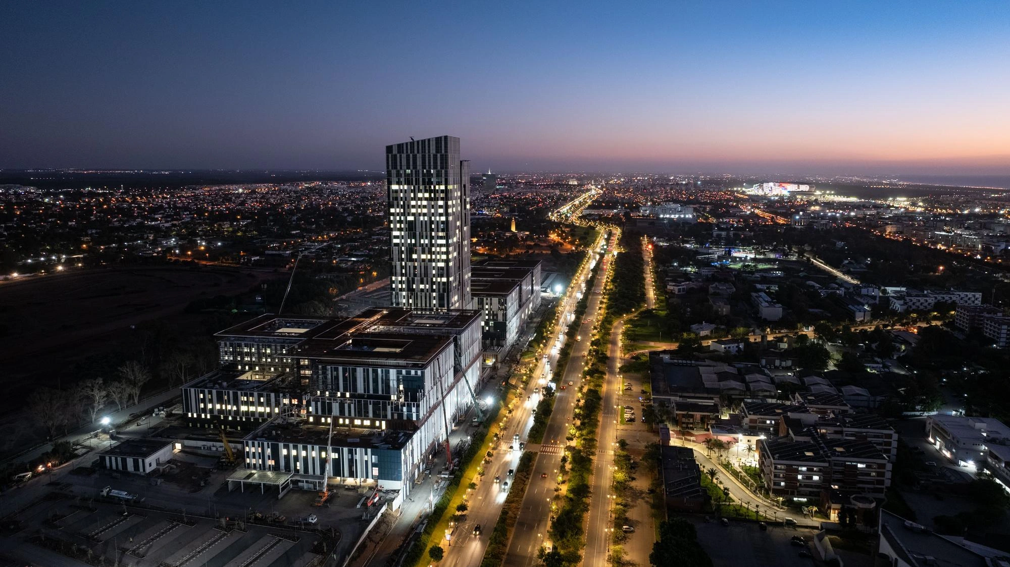 Spanning 280,000 m², the complex features four six-storey buildings and a landmark 25-storey tower, accommodating advanced medical and teaching facilities. It offers 600 beds and 24 operating theatres, including 19 integrated operating suites equipped for hybrid and robotic procedures. The hospital supports 143 intensive care beds, 30 neonatal incubators, and specialised units for burns and hyperbaric treatment, the only facility of its kind in Morocco.