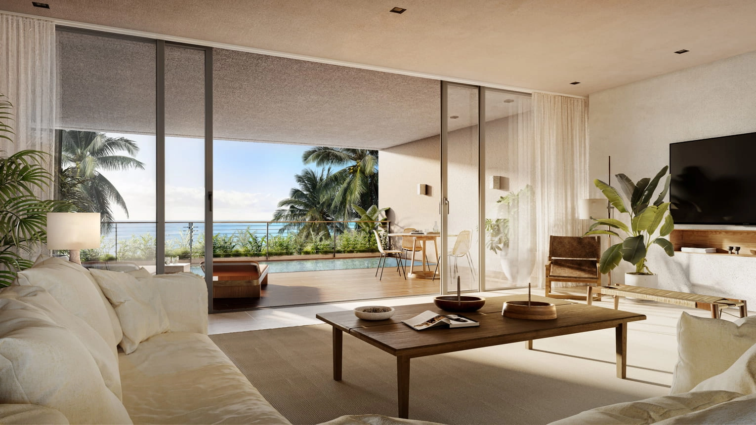 Un salon moderne et lumineux avec des meubles clairs et des plantes vertes, s'ouvrant par de grandes baies vitrées sur un balcon avec une piscine, des palmiers et la mer bleue.