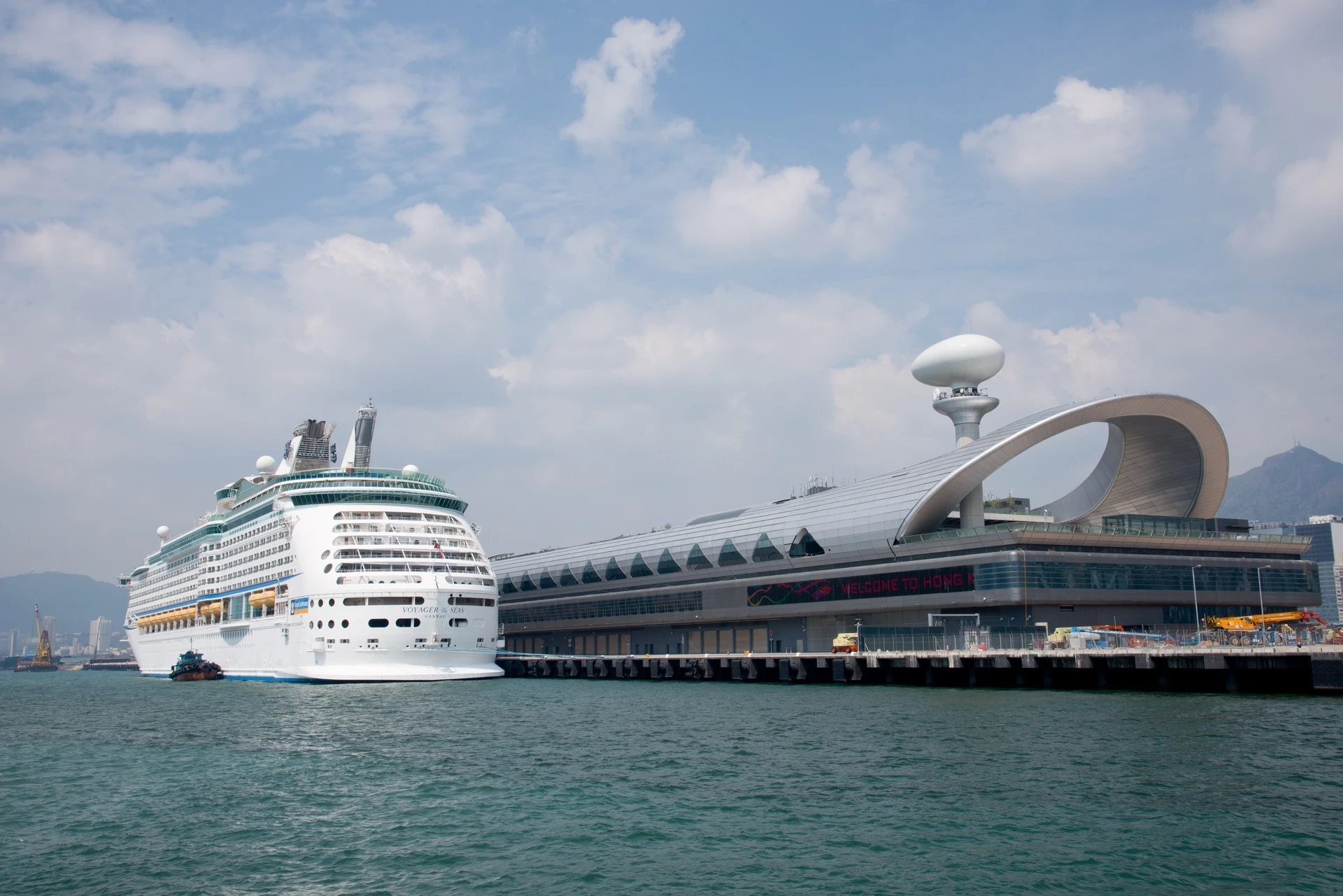 Un grand paquebot blanc est amarré à un terminal moderne gris avec un toit incurvé et une tour en forme d'œuf, sous un ciel partiellement nuageux. Un panneau numérique sur le bâtiment affiche "WELCOME TO HONG KONG".