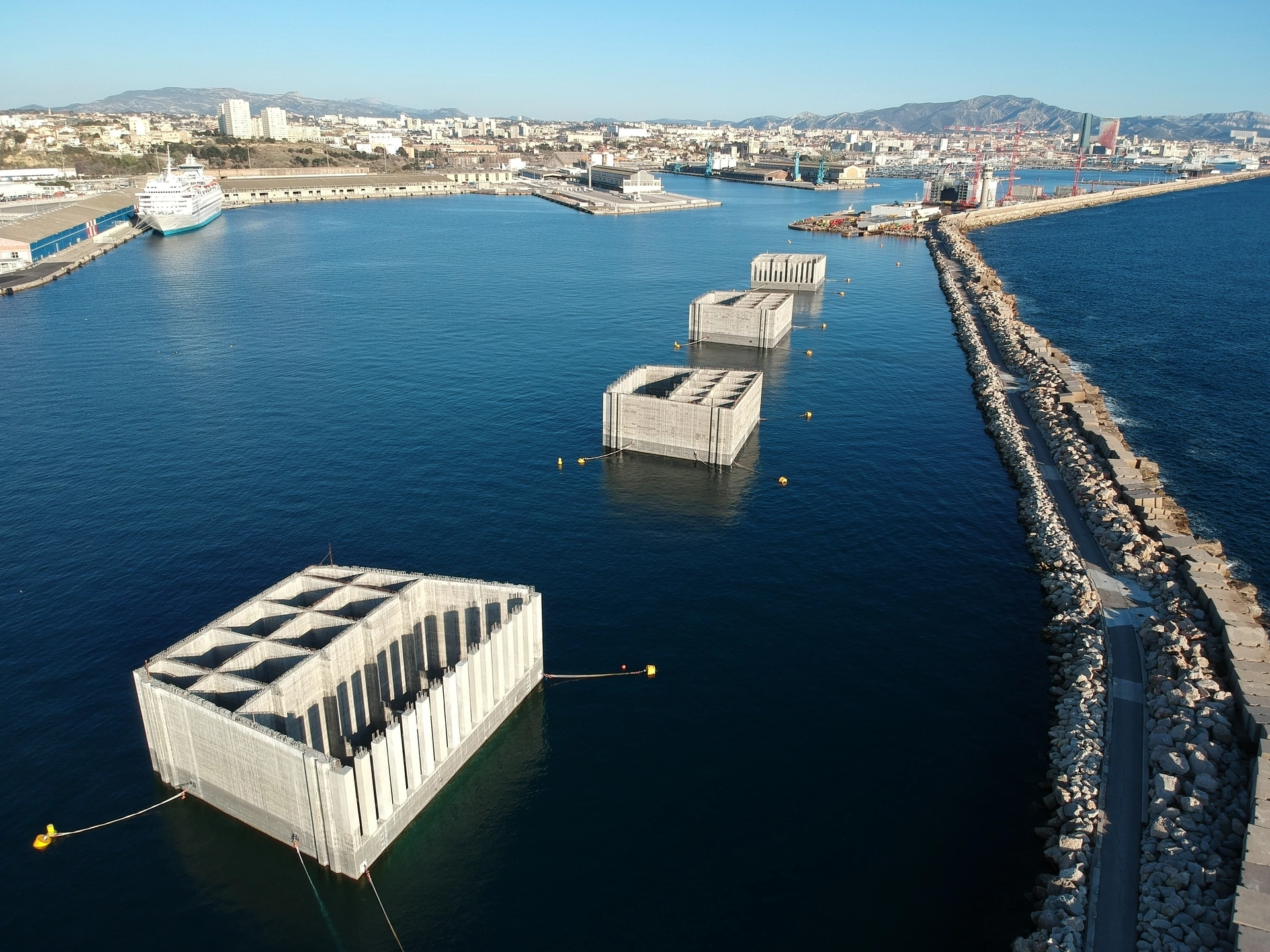 Vue aérienne d'un vaste port où quatre immenses caissons flottants en béton gris sont alignés dans les eaux bleues. En arrière-plan, on aperçoit une ville portuaire animée avec un navire de croisière et des montagnes sous un ciel clair, séparée par un long brise-lames.