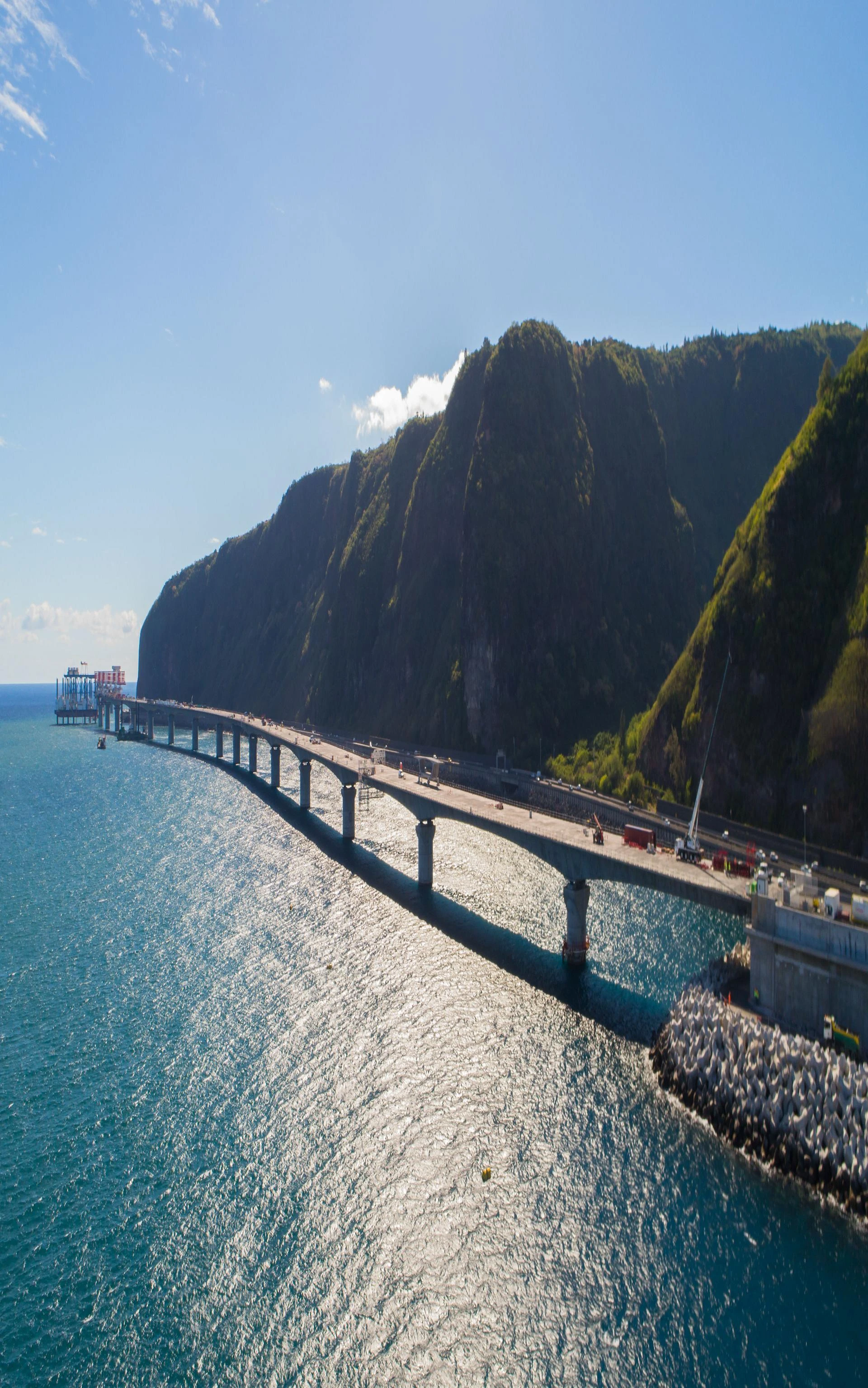The Nouvelle Route du Littoral Viaduct connects Saint-Denis to La Grande Chaloupe. Designed to keep vehicles away from the risk of cliff collapses and to withstand cyclonic swells, this offshore viaduct runs along the coastline for 5.4 kilometers between the north and west of Réunion Island.