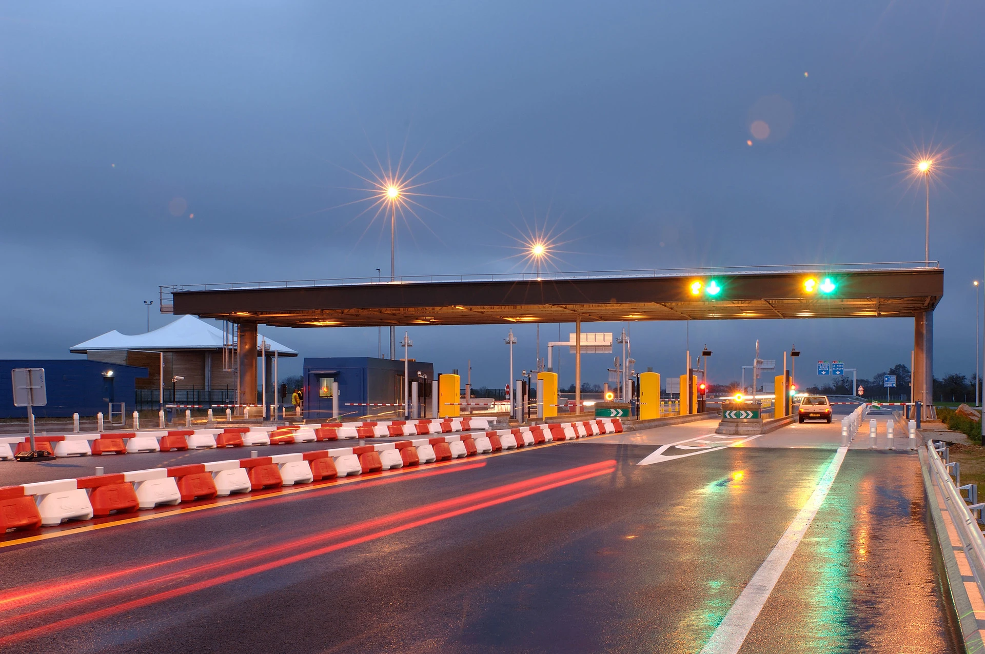 Un péage autoroutier illuminé au crépuscule, avec de multiples voies de paiement jaunes et des barrières rouges et blanches. Les lumières vertes et jaunes vives se reflètent sur l'asphalte mouillé, tandis que des traînées lumineuses rouges indiquent le passage des véhicules.