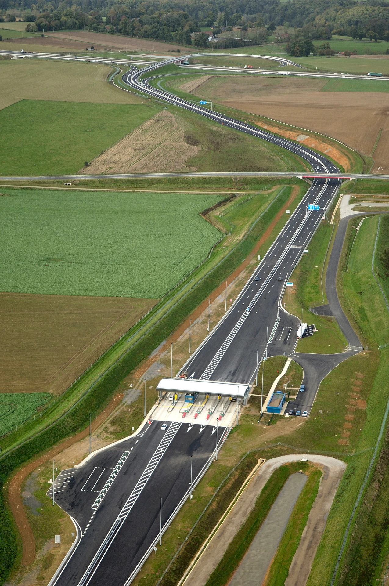 Vue aérienne d'une autoroute noire immaculée avec un poste de péage à plusieurs voies et un complexe échangeur, serpentant à travers des champs agricoles verts et bruns.