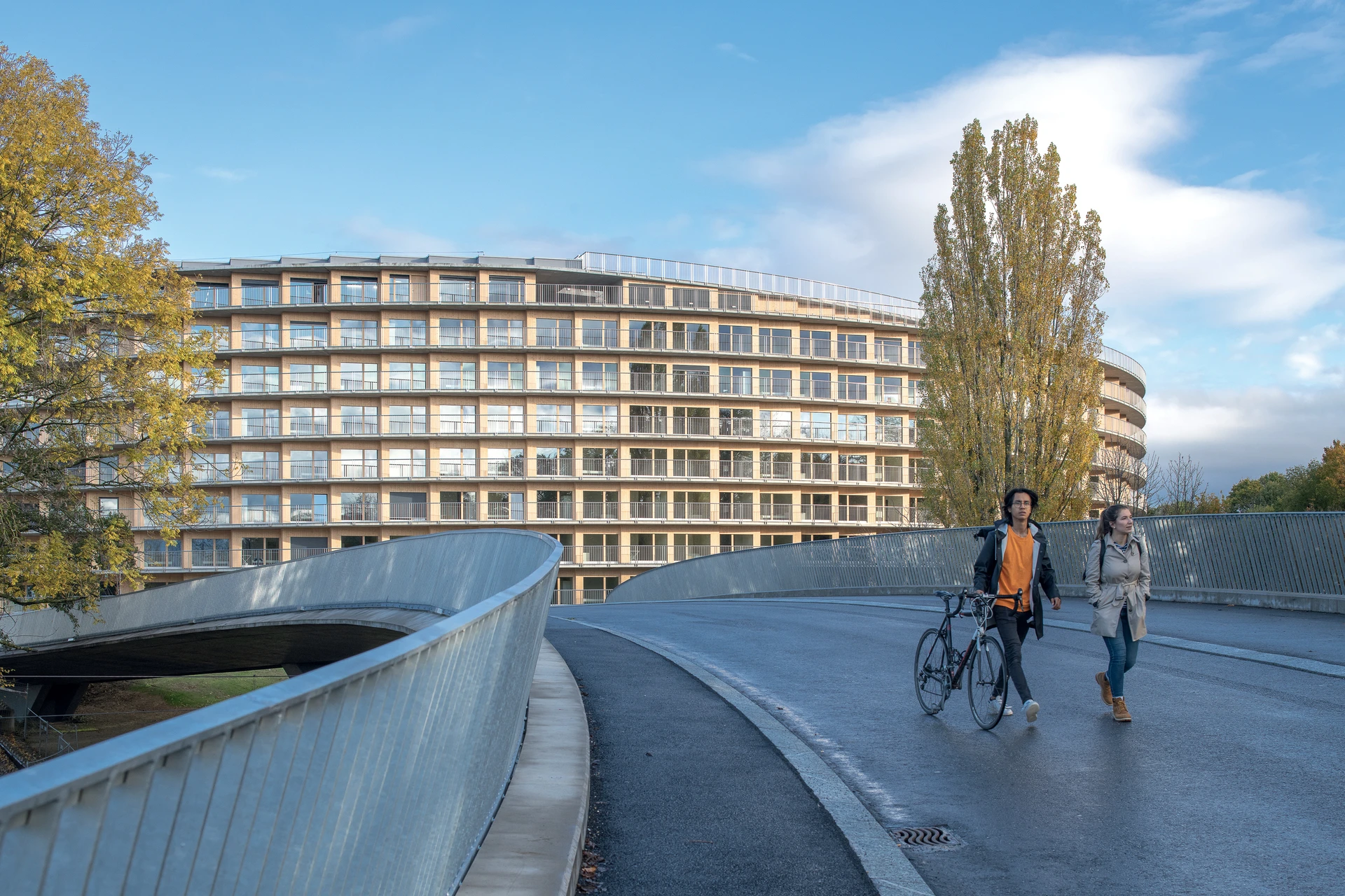The Vortex stands as a striking new landmark in the Lausanne region, designed to meet the growing demand for student accommodation and serve as the Olympic Village for the 2020 Youth Olympics. Delivered in record time by Losinger Marazzi, the Swiss subsidiary of Bouygues Bâtiment International, this innovative circular building forms a unique bridge between the city and the university campuses. Its spiral architecture hosts 712 student units across nine levels, arranged along a continuous ramp that creates a dynamic, connected living space. The central open courtyard functions as a village square, fostering community, encounter, and exchange.