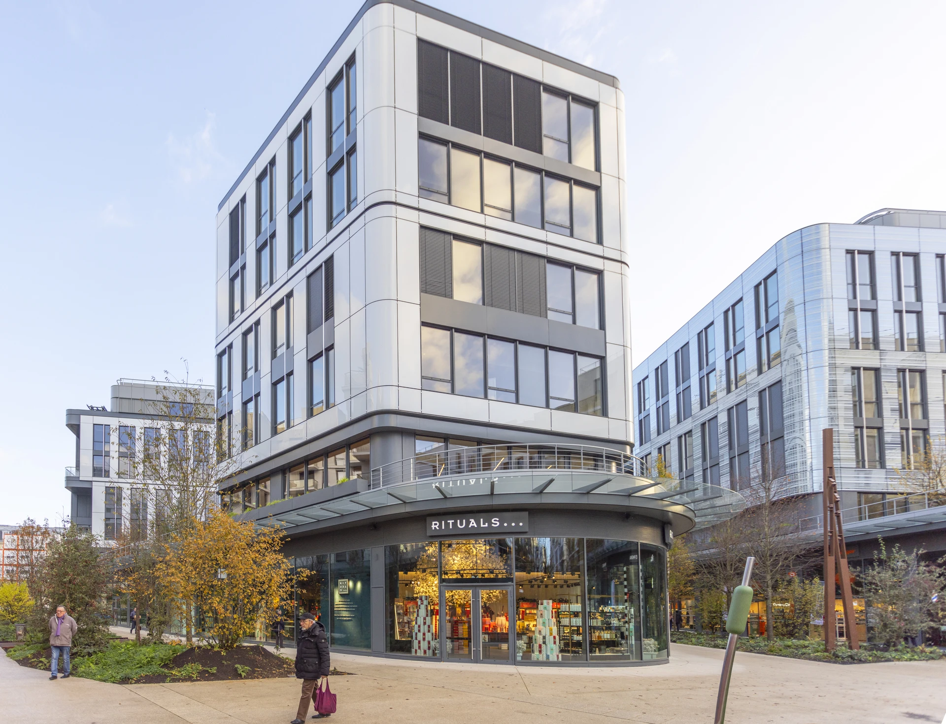Un bâtiment moderne aux façades blanches et grises, avec de grandes fenêtres, abrite un magasin "Rituals..." aux vitrines incurvées au rez-de-chaussée, entouré d'une zone piétonne avec des arbres aux feuilles automnales et quelques passants.