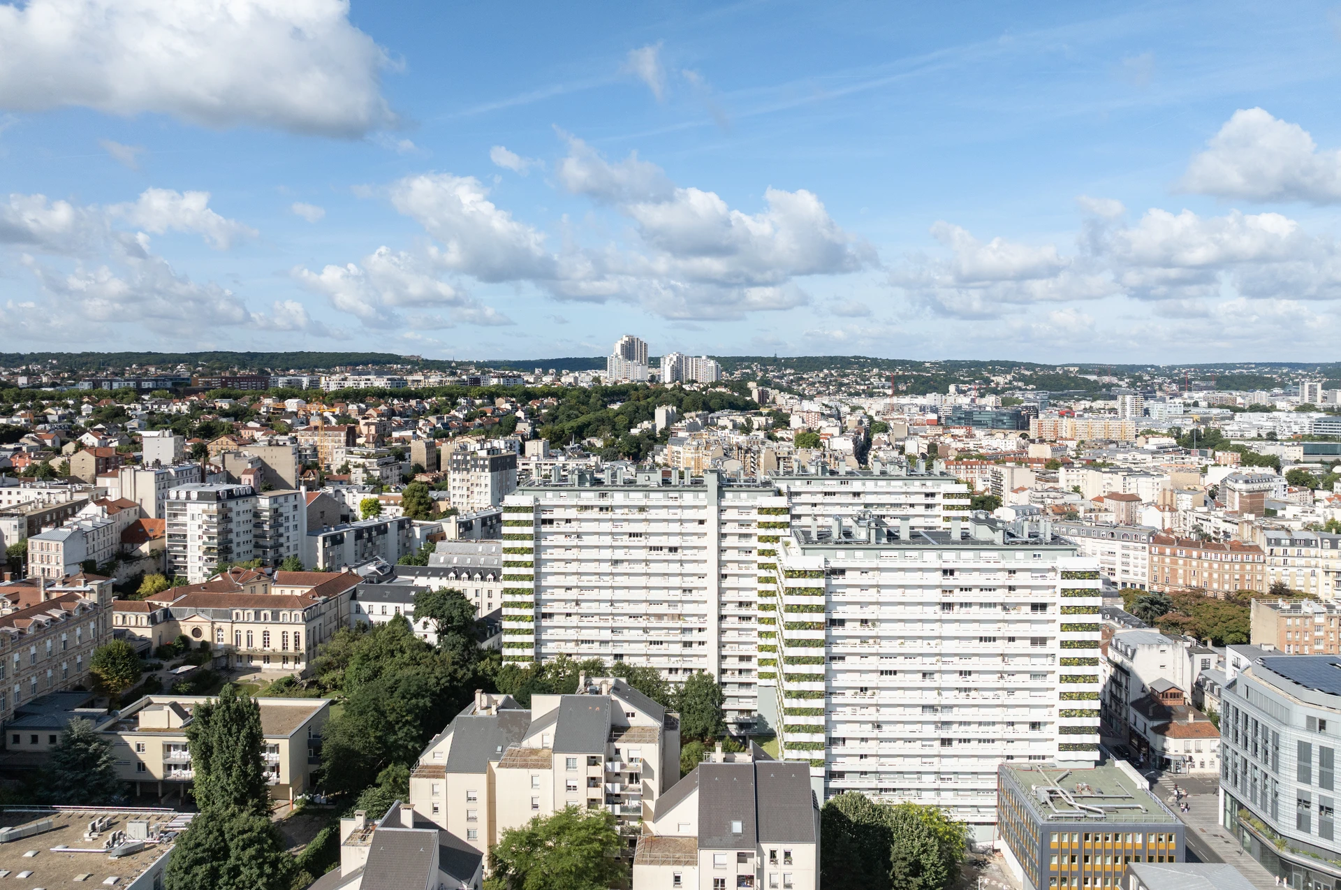 Vue aérienne d'une ville sous un ciel bleu parsemé de nuages, présentant des immeubles résidentiels blancs modernes avec des jardins verticaux en façade, entourés d'un tissu urbain dense mêlant habitations et espaces verts s'étendant vers l'horizon.