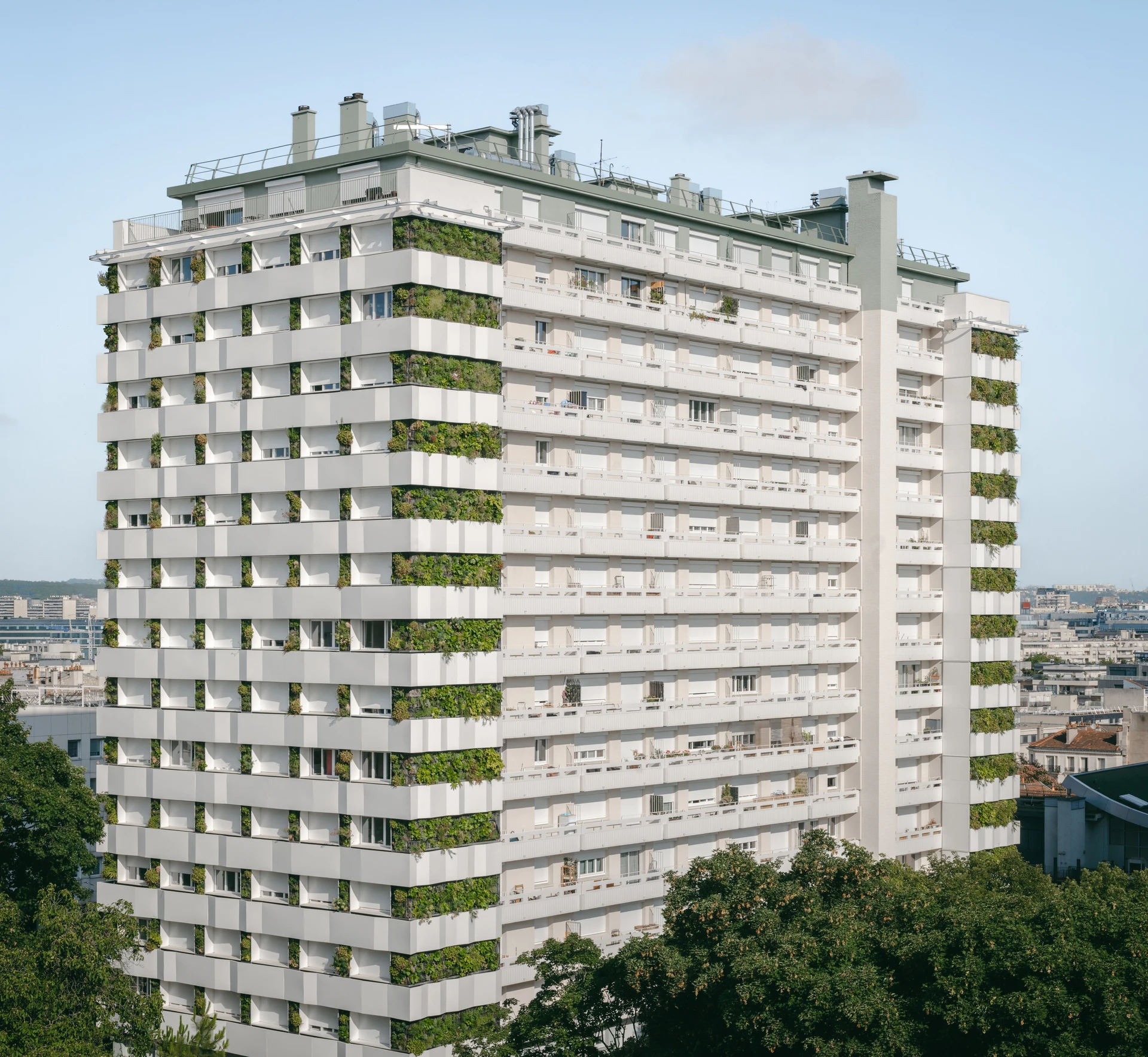 Immeuble résidentiel moderne gris clair et blanc, caractérisé par des jardins verticaux verts luxuriants intégrés à sa façade en escalier, sous un ciel bleu clair.