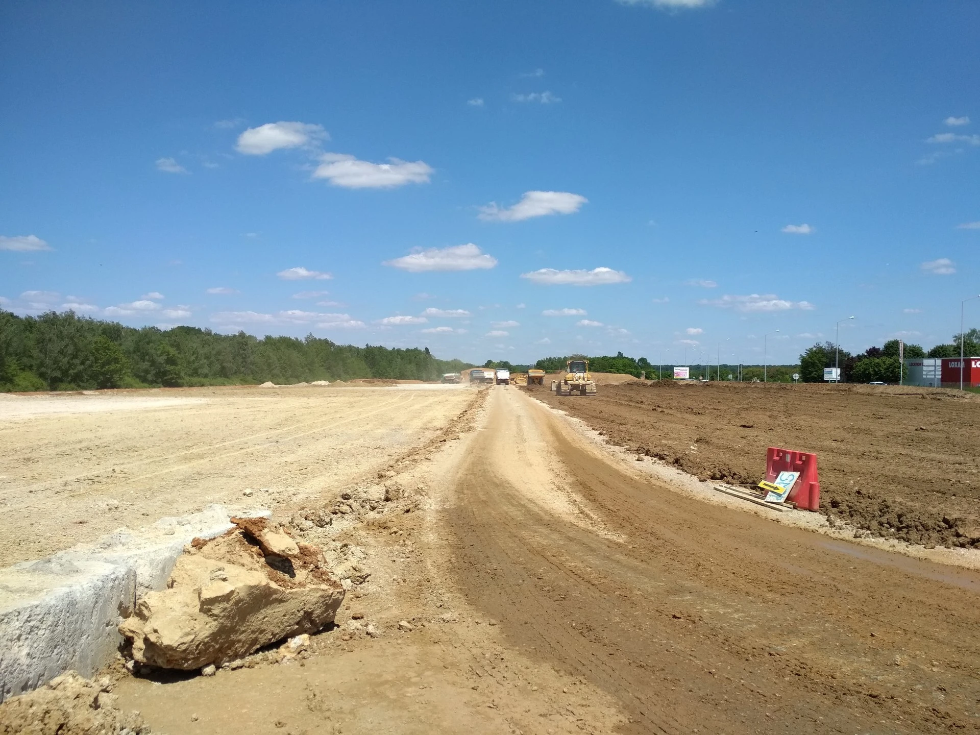 Un vaste chantier ensoleillé présente une route en terre traversant des zones de sol beige et brun, avec des excavateurs et des camions travaillant au loin sous un ciel bleu parsemé de nuages blancs.