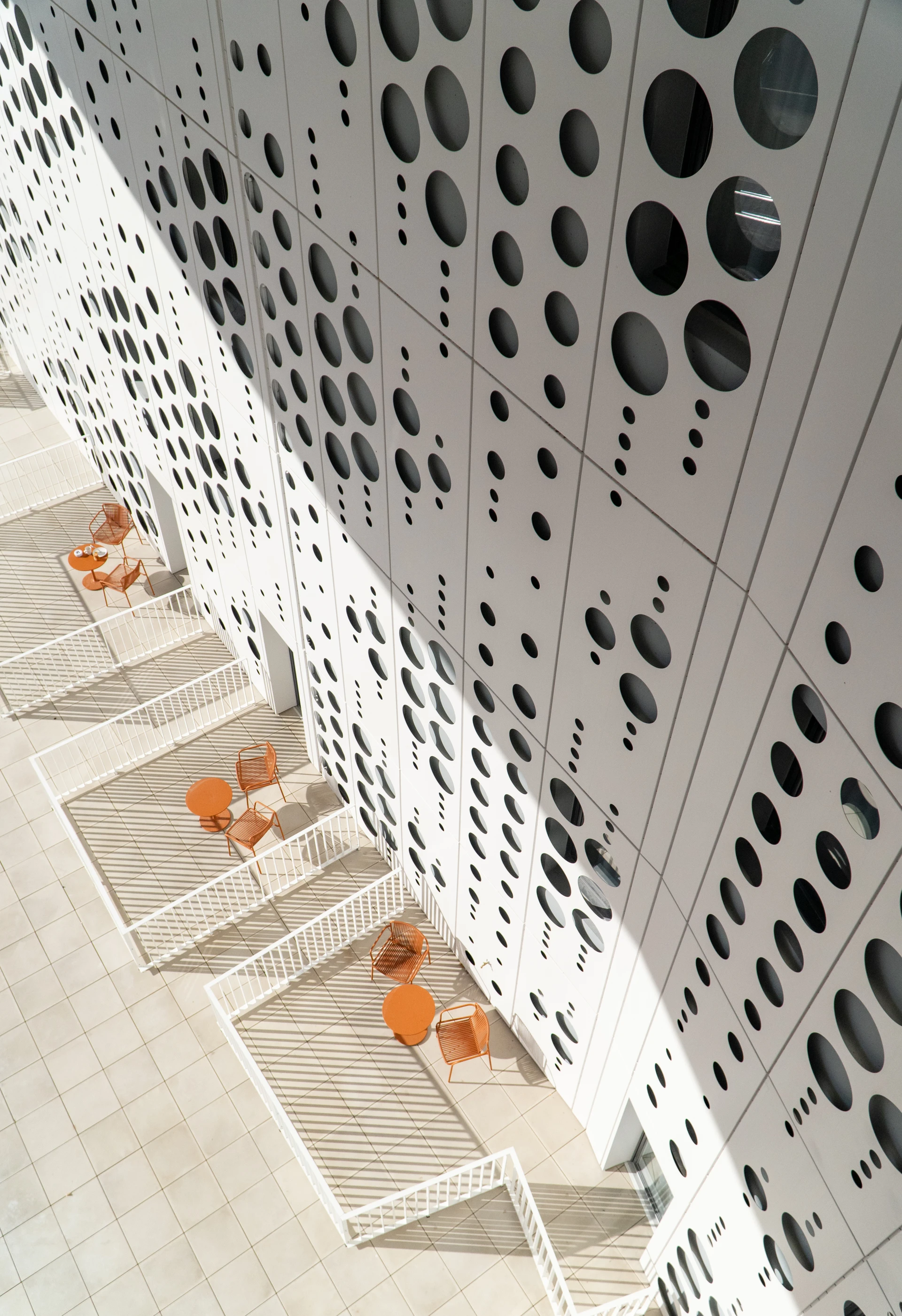Façade blanche d'un bâtiment moderne ornée de nombreux motifs circulaires, avec des terrasses en contrebas équipées de chaises et tables orange sous un soleil intense projetant des ombres rayées.