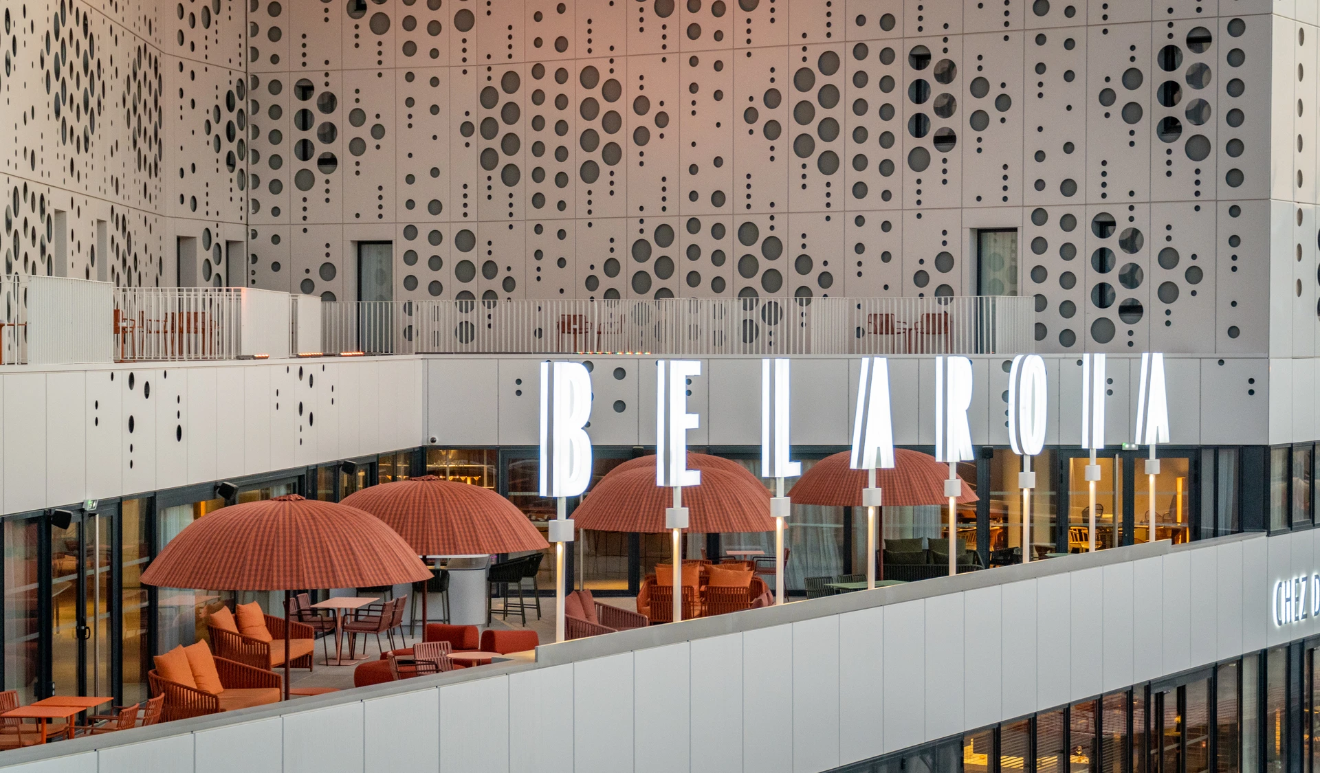 Façade d'un bâtiment moderne ornée d'un motif à pois noirs, avec l'enseigne lumineuse "BELLAROMA" surplombant une terrasse extérieure meublée de parasols et sièges couleur terracotta.