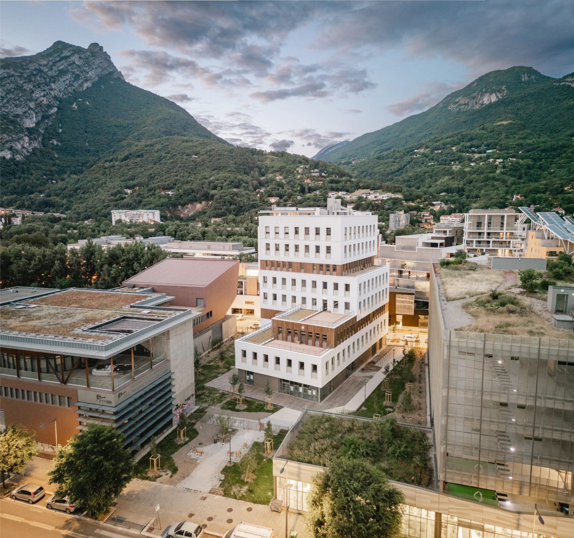 Un bâtiment moderne blanc et bois se dresse au centre d'un campus urbain avec toits végétalisés et panneaux solaires, encadré par de vertes montagnes sous un ciel nuageux au crépuscule.