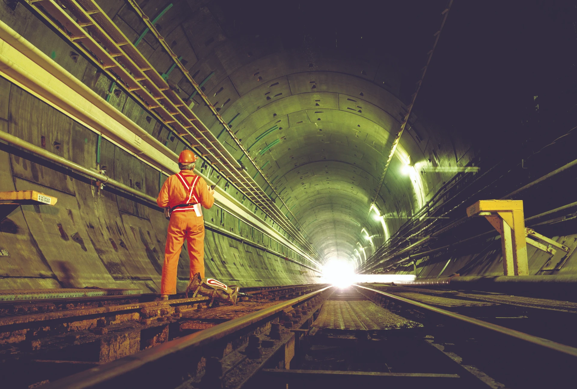 Un ouvrier en tenue de sécurité orange et casque de chantier regarde au loin dans un long tunnel ferroviaire aux murs vert pâle, où une lumière éclatante brille au bout des rails.