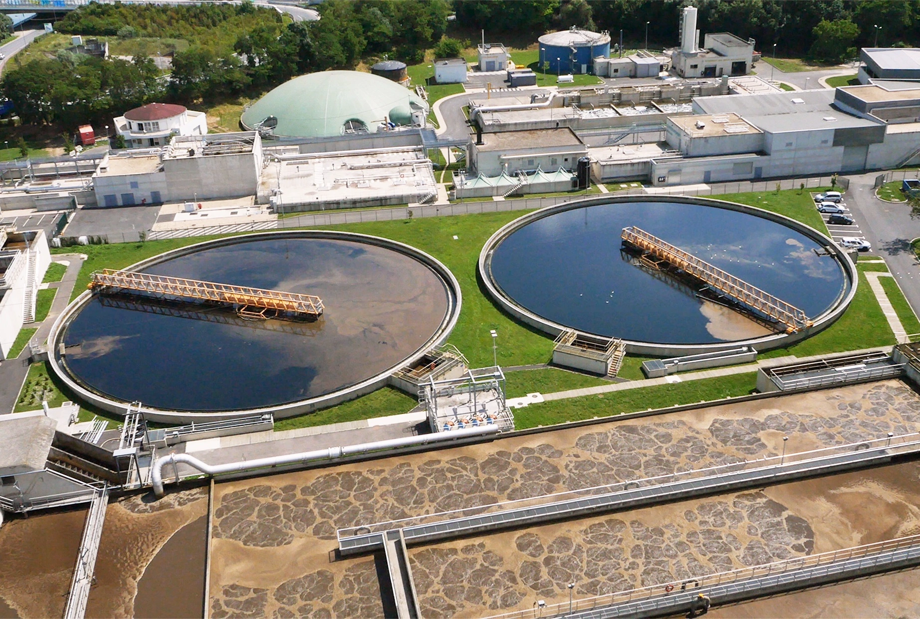 Vue aérienne d'une usine de traitement des eaux usées montrant deux grands bassins circulaires de décantation avec des mécanismes rotatifs sur une eau foncée, et plusieurs bassins rectangulaires d'aération bouillonnante de couleur marron, le tout entouré de bâtiments industriels et de pelouses vertes.