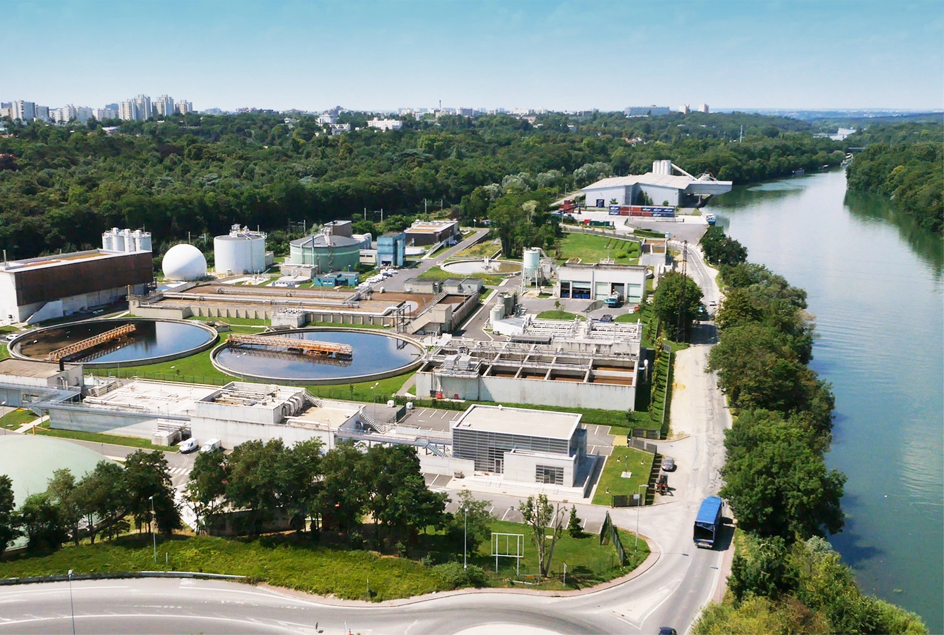Vue aérienne d'une grande station d'épuration moderne, caractérisée par des bassins circulaires, des réservoirs blancs et divers bâtiments industriels. Elle est implantée au bord d'une large rivière et d'une forêt dense, avec une ville à l'horizon sous un ciel bleu.