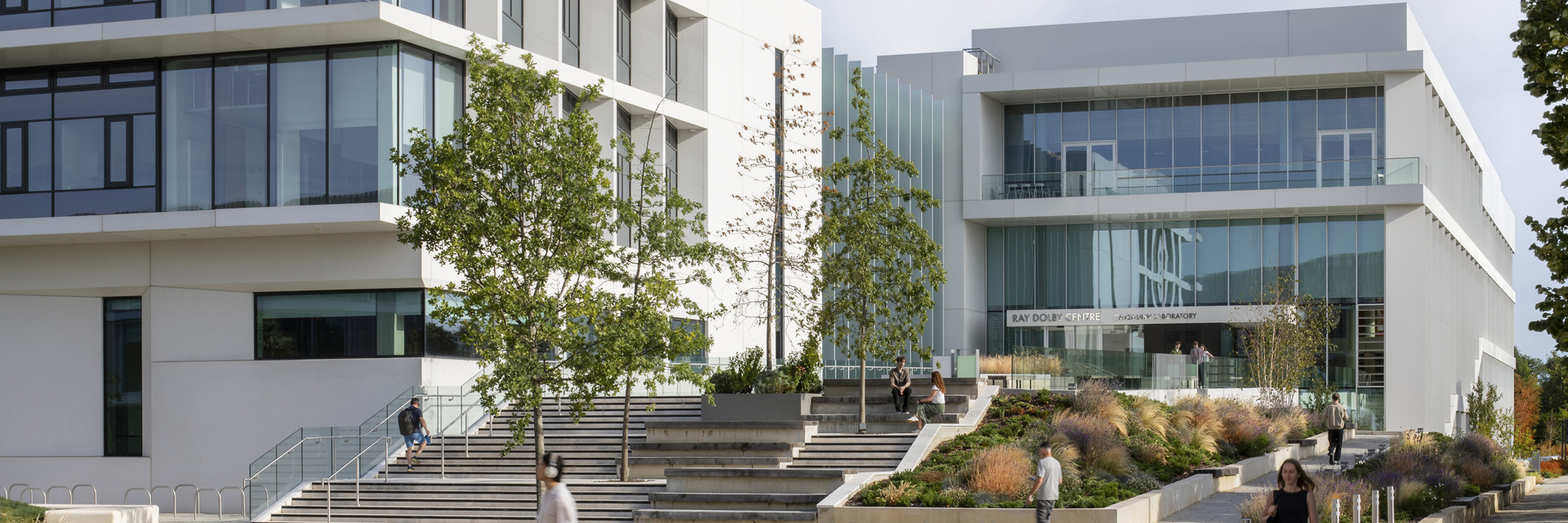 Vue extérieure de bâtiments modernes blancs et vitrés, avec des escaliers, des arbres et des jardins aménagés. Plusieurs personnes marchent ou sont assises sur les marches. Le bâtiment de droite porte l'inscription "RAY DOLBY CENTRE".